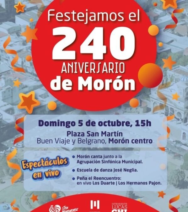 El Municipio de Morón festeja el 240º aniversario de la ciudad. El evento será el domingo 5 de octubre, desde las 15 hs, en la Plaza San Martín ubicada en Buen Viaje y Belgrano de Morón centro. La celebración contará con la participación de artistas seleccionados del concurso “Morón Canta”, certamen de canto vocacional para vecinos mayores de 16 años, que tendrán la posibilidad de presentarse junto a la Agrupación Sinfónica Municipal. Además actuarán en la Plaza alumnos de la Escuela de Danzas José Neglia, y de la Peña El Reencuentro que animará la tarde con las actuaciones en vivo de Los Duarte y Los Hermanos Pajón. En el marco de los 240 años de Morón, el Municipio también presentará la muestra de arte “Dios no se cansa de perdonar. Argentino Universal”, realizada por Factor Francisco, que reúne imágenes, colores y palabras sobre la vida y el mensaje del Papa Francisco. La exposición podrá visitarse del jueves 2 al sábado 4 y del lunes 6 al jueves 9 de octubre, de 8 a 16 hs, en Buen Viaje 968 de Morón centro. El origen de Morón se remonta al siglo XVI, con el primer reparto de tierras realizado por Juan de Garay en 1580. El pueblo se consolidó alrededor de la capilla de Nuestra Señora del Buen Viaje, fundada en 1760. El nacimiento y nombre del municipio se establecieron oficialmente el 5 de octubre de 1785, bajo la denominación “Cañada de Morón”.
