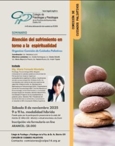El Colegio de Psicólogas y Psicólogos de la Provincia de Buenos Aires de la Regiòn XIV con sede en Morón realizará un Seminario sobre el tema » La Atención del Sufrimiento en torno a la Espiritualidad» organizado por la Comisión de Cuidados Paliativos de la entidad, coordinado por la Licenciada Verónica Lucini junto a los miembros asistentes Lic. Analía Domínguez, Lic. Gladys Morelli, Lic. María Alejandra Pisano, Lic. Natalia Russo y la Lic. Anahí Tejada.