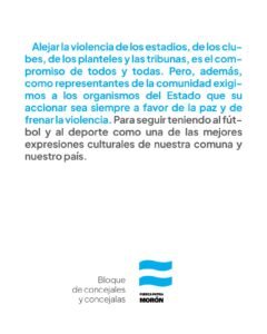 Alejar la violencia es los estadios de los clubes, de los planteles , de las tribunas es el compromiso de todos .Pero además como representantes de la comunidad exigimos a los organismos del Estado que su accionar sea siempre a favor de la paz y de frenar la violencia. Para seguir teniendo al fútbol y al deporte como una de las mejores expresiones culturales de nuestra comuna y nuestro partido .