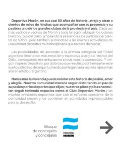 Desde el Honorable Concejo Deliberante de Morón se ha emitido un comunicado por parte del bloque de concejales y concejalas de Fuerza Patria Morón respecto a los hechos de violencia ocurridos el pasado domingo en el encuentro entre Deportivo Morón y Deportivo Madryn. El mismo dice así : » Deportivo Morón en sus casi 80 años de historia atrajo y atrae a cientos de miles de hinchas que acompañan con su presencia y su pasión a uno de los grandes clubes de la Provincia y país.