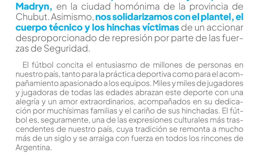 Asimismo nos solidarizamos con el plantel, el cuerpo técnico y los hinchas víctimas de un accionar desproporcionado de represión por parte de las Fuerzas de Seguridad.