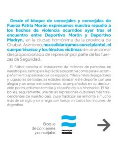 Desde el Bloque de Concejales y Concejalas de Fuerza Patria Morón expresamos nuestro repudio a los hechos de violencia ocurridos ayer tras el encuentro entre Deportivo Morón y Puerto Madryn en la ciudad homónimo de la Provincia de Chubut.